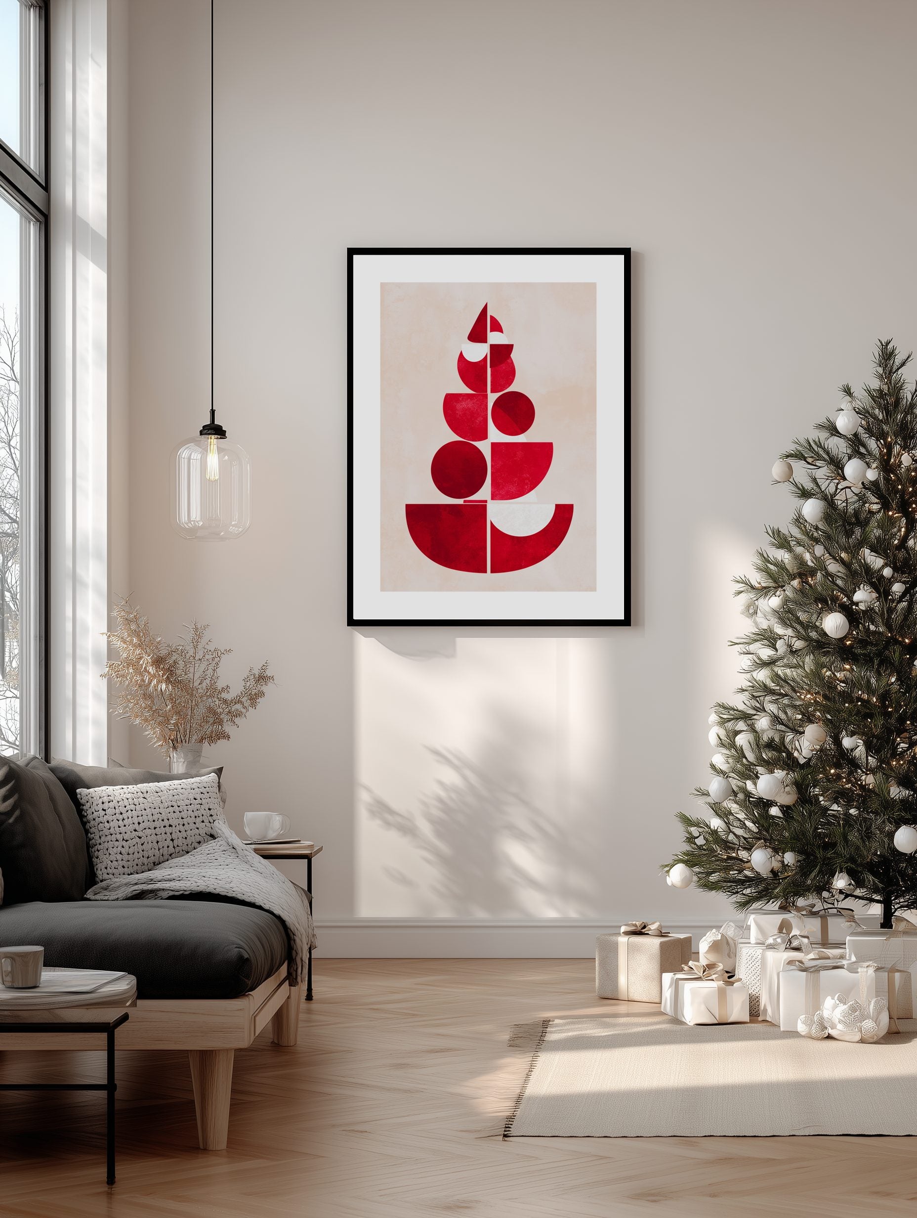 A modern Christmas poster featuring a stylized red geometric tree on a soft beige background. Minimalist festive art that adds a clean Scandinavian touch to any interior.