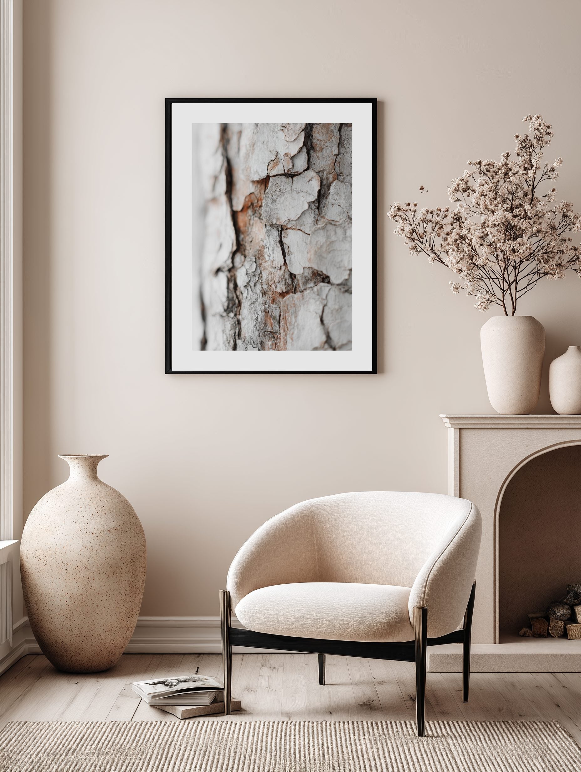 A macro photograph of birch bark revealing fine details and natural earthy contrasts. A timeless Scandinavian wall print designed to add warmth and organic elegance.