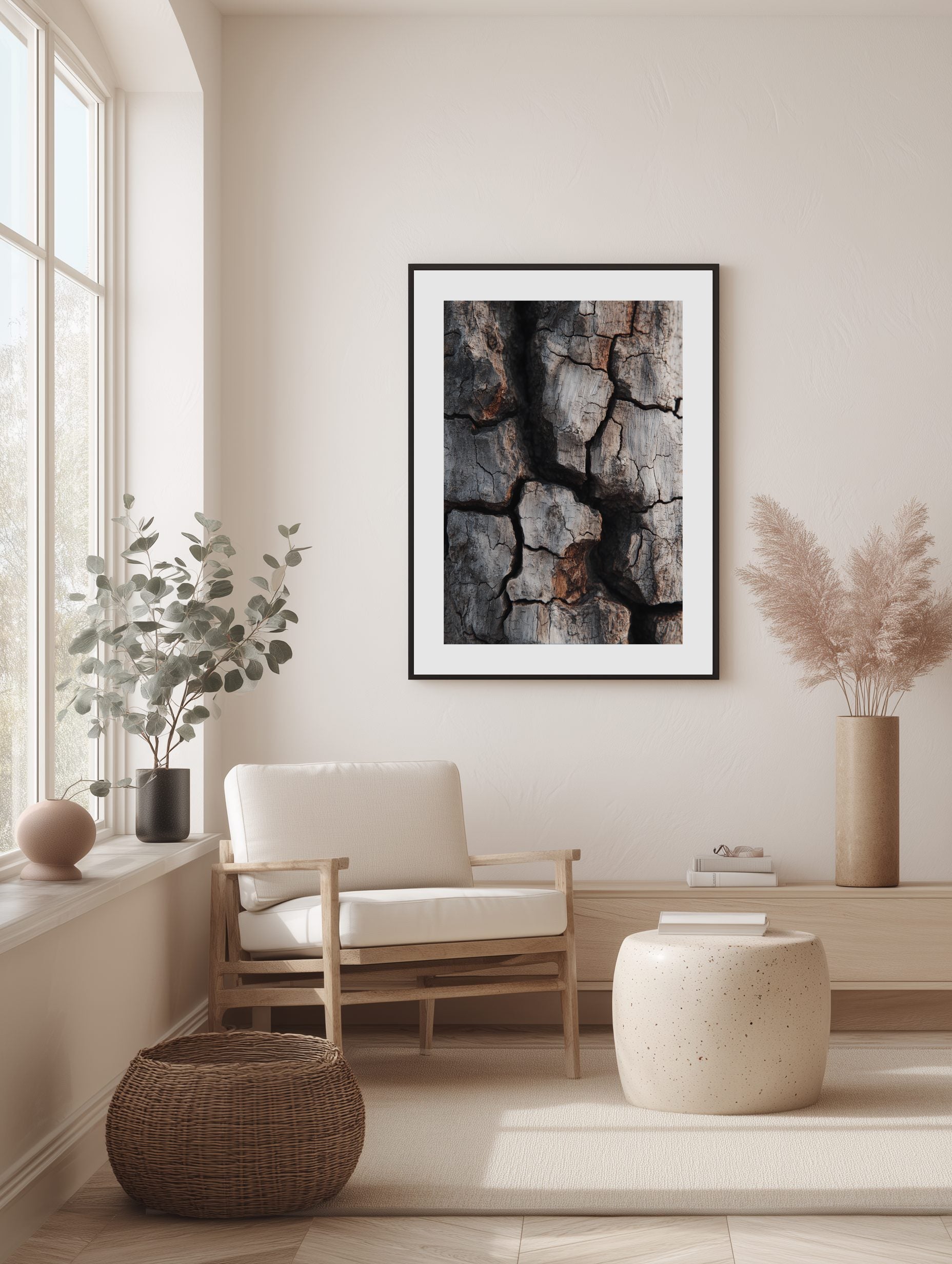 A dramatic macro photograph of dark cracked bark with warm earthy highlights. This textured nature poster creates contrast and depth in Scandinavian-inspired spaces.