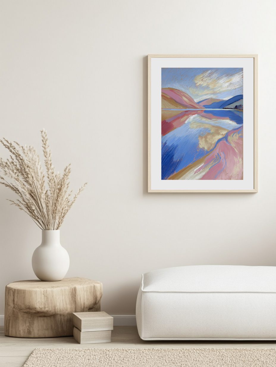 A tranquil lake reflects soft hills and a pastel sky. This landscape exudes peaceful reflection and calm, perfect for creating a soothing atmosphere.