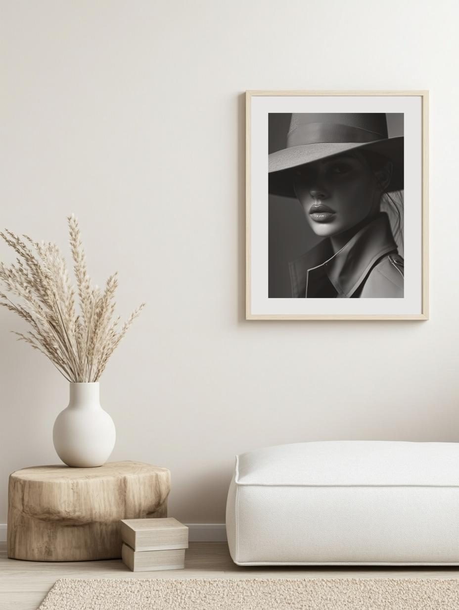 A cinematic black and white portrait of a woman in a wide-brim hat and trench coat. Perfect for fashion-inspired interiors.