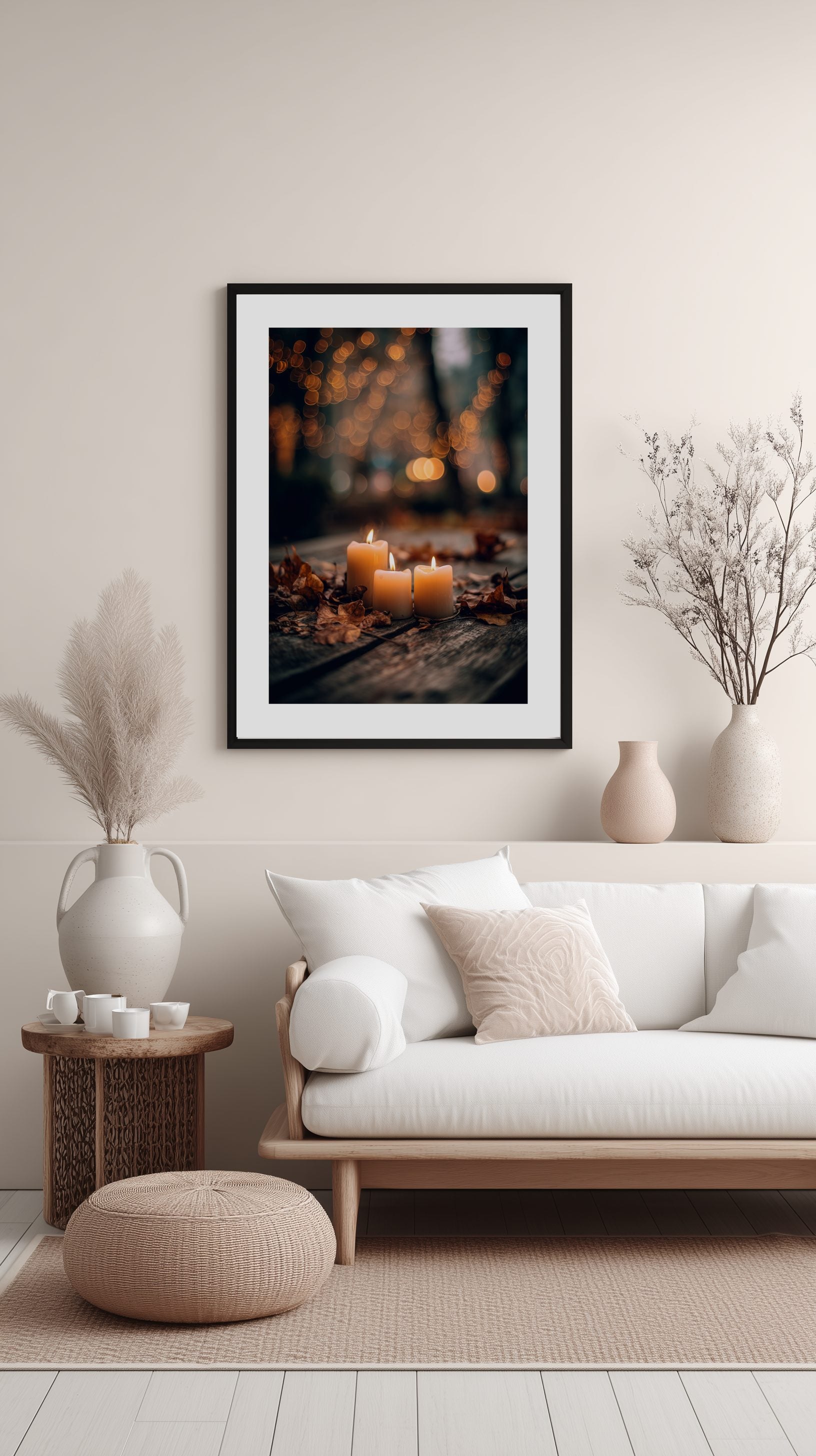 This cozy poster features a cluster of glowing candles on a rustic wooden table with autumn leaves. The perfect wall art to bring warmth into your living space.
