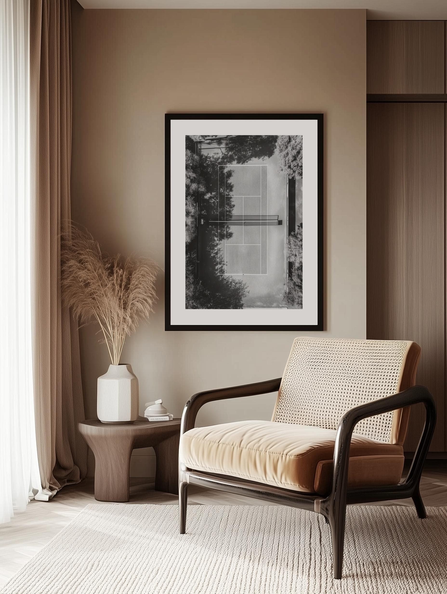 Black and white aerial view of a clean tennis court. Great for sports lovers and clean design fans.