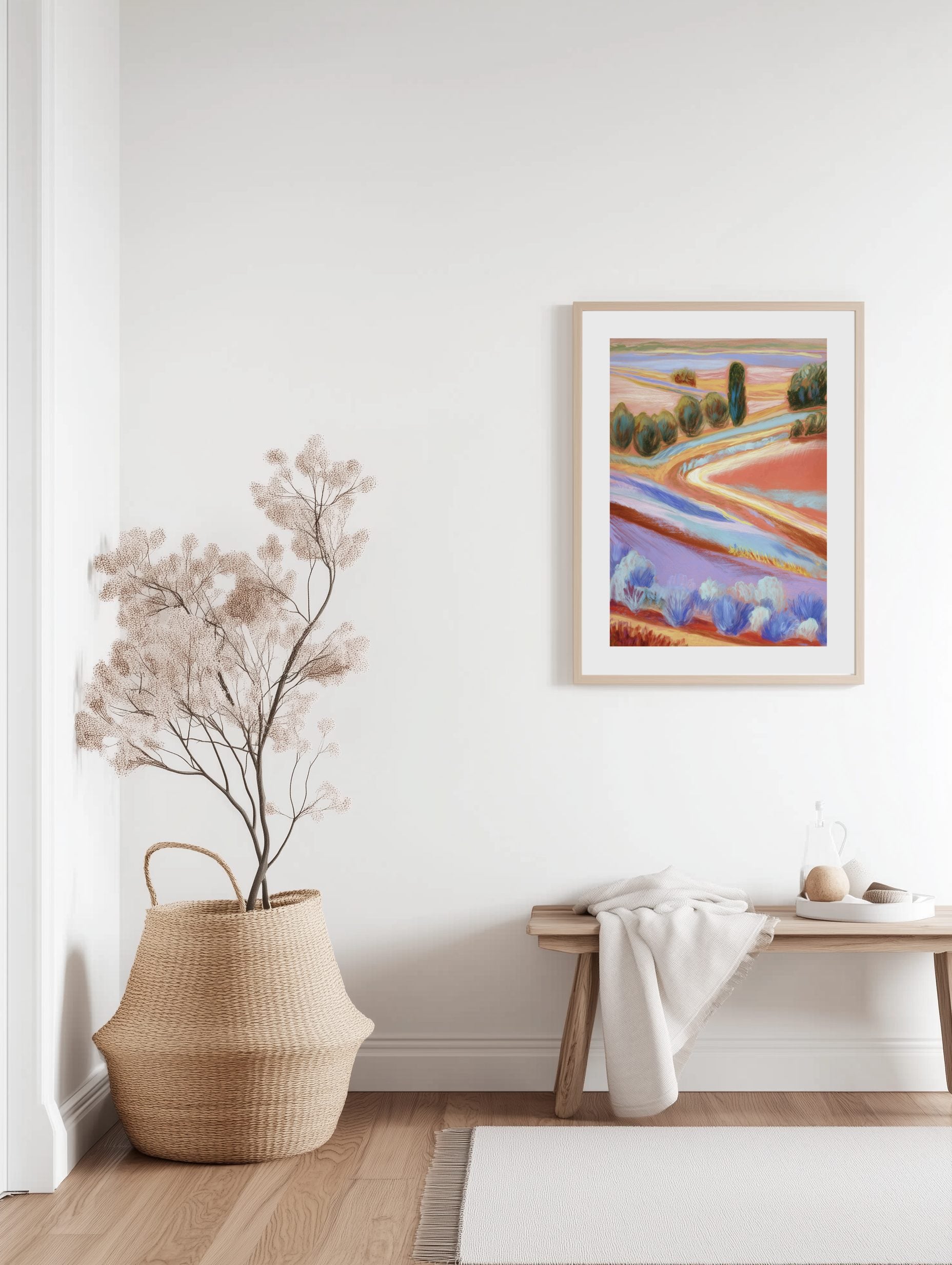 A lush countryside view with winding paths and soft, colorful brushstrokes. The mix of warm and cool tones evokes a peaceful journey through serene fields and rolling hills.