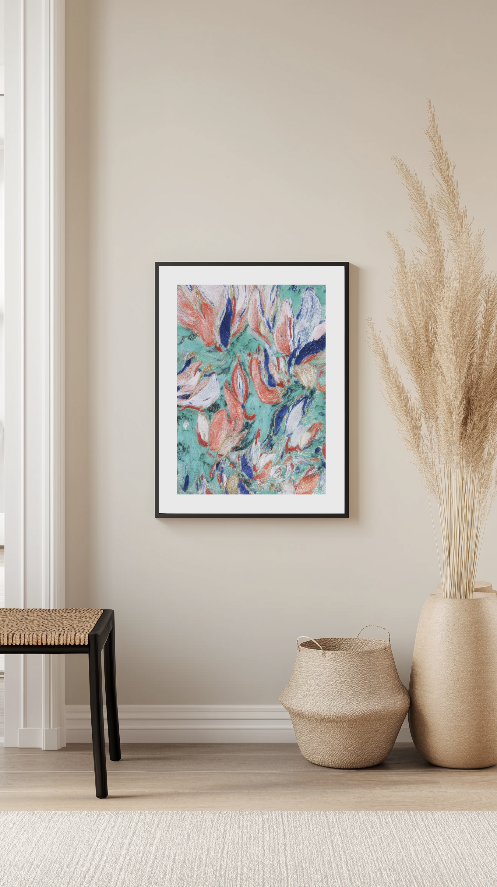 En livlig och texturerad komposition av virvlande kronblad i rörelse, denna poster fångar essensen av blommig abstraktion. Perfekt för utrymmen som längtar efter färg och energi.