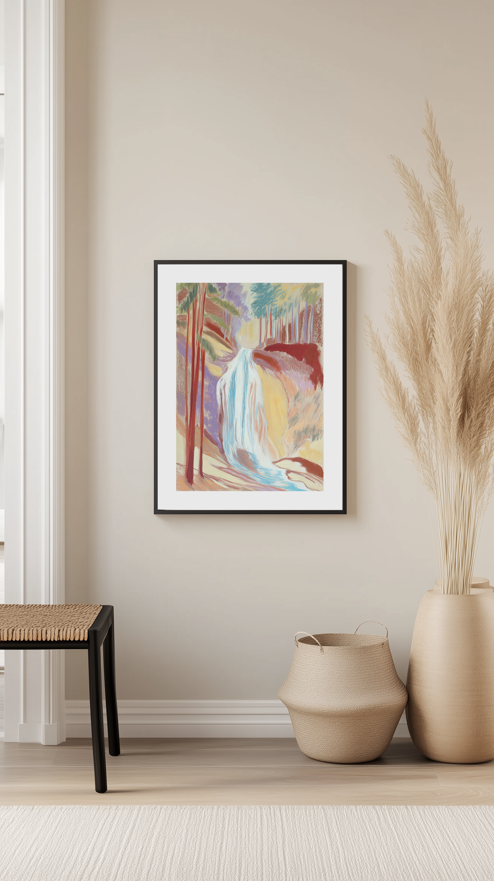Ett mjukt men ändå livfullt vattenfall som forsar genom en fridfull skog. Detta konstverk ger en känsla av fridfull natur och rörelse till vilken vägg som helst.