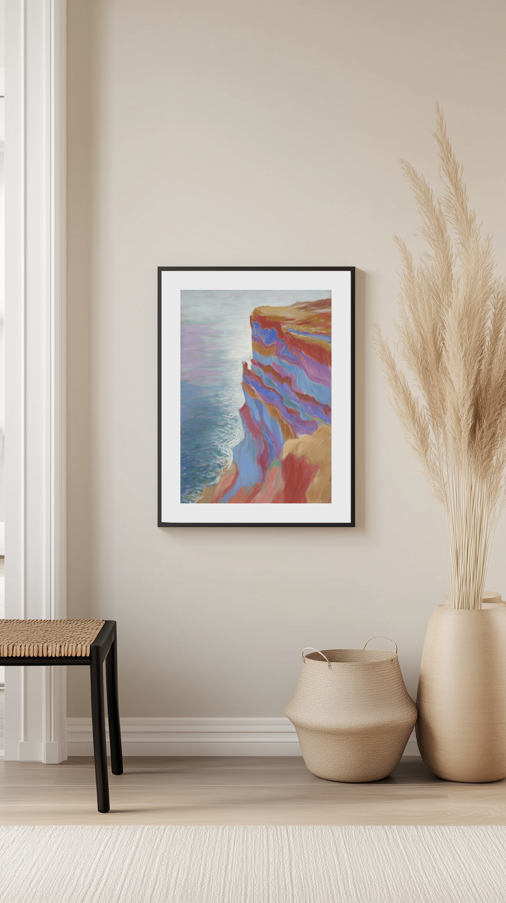 Branta klippor stupar ner i havet i detta pastellfärgade havslandskap. En dramatisk men mjuk skildring av naturens gränser, perfekt för modern kustinredning.