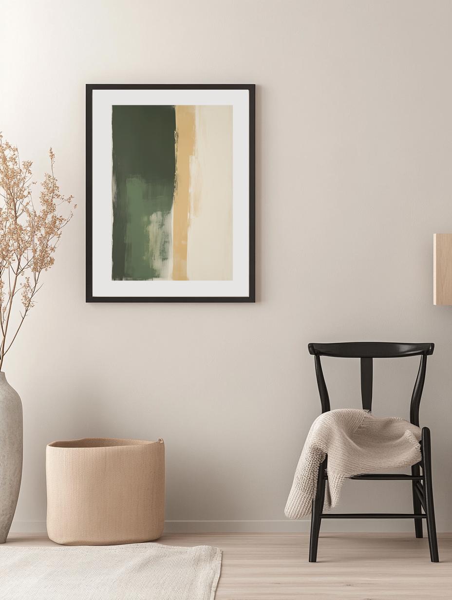 En djärv och livfull vertikal abstrakt poster med gröna, guldiga och krämfärgade penseldrag.