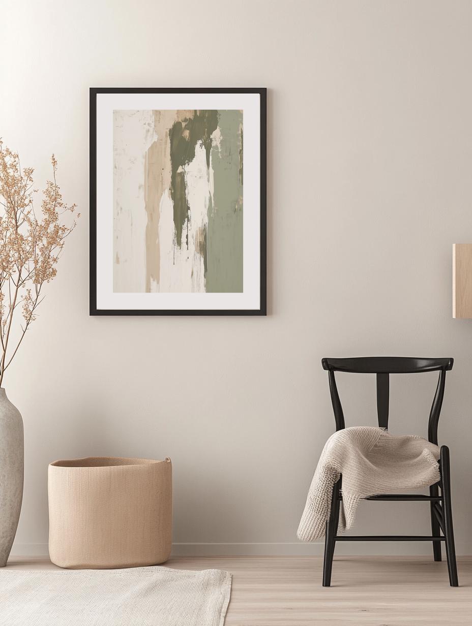Dramatisk vertikal abstrakt målning med olivfärgade, beige och krämfärgade penseldrag.